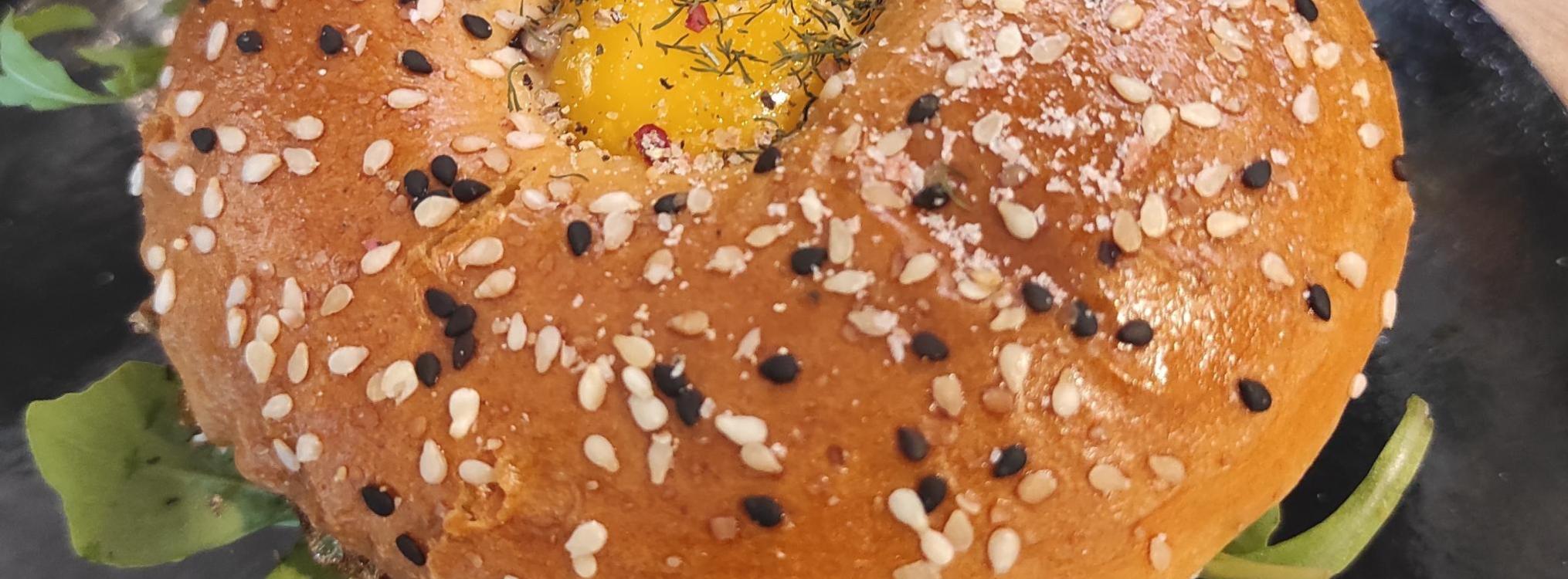 Ici rien de spécial, juste une petite idée de présentation du bagel avec le jaune d’œuf sur le dessus.