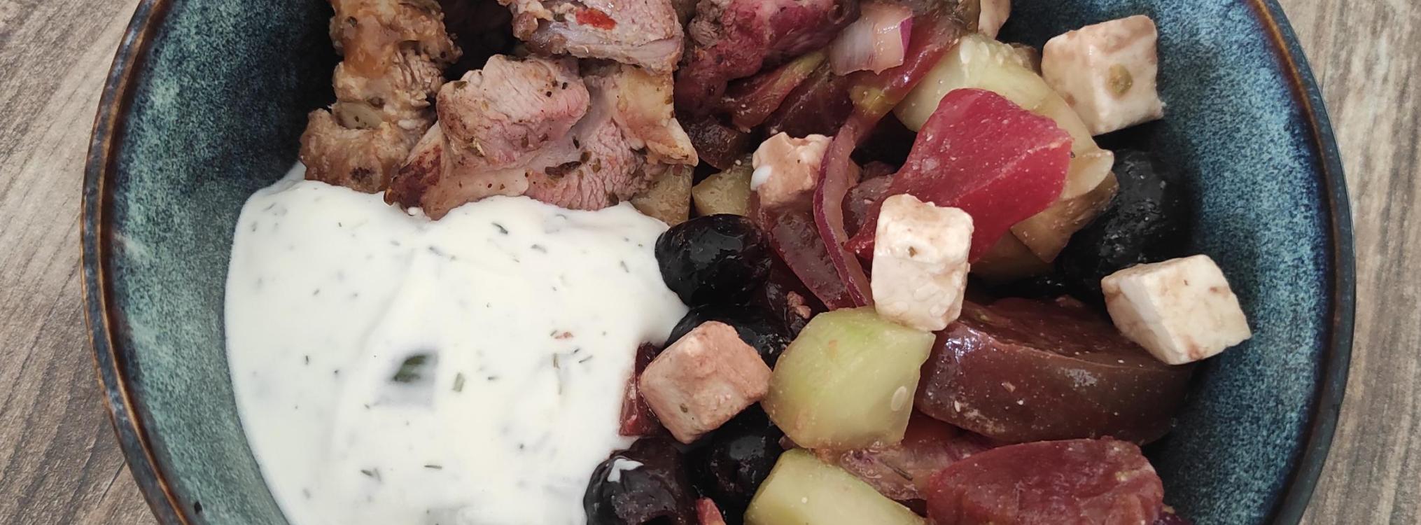 Dans un bowl, mettre la salade à la grecque, l'agneau et le tzatzki.
