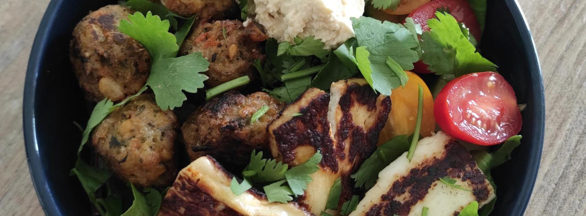 Du coup, je n'ai pas pu résister à me faire un bon bowl libanais ! Du houmous, du halloumi, par contre pour moi c'est sans coriandre. Je fais partie de celles et ceux qui détestent la coriandre, c'est vraiment physique ! Rien que l'odeur me donne des hauts le cœur 🤢