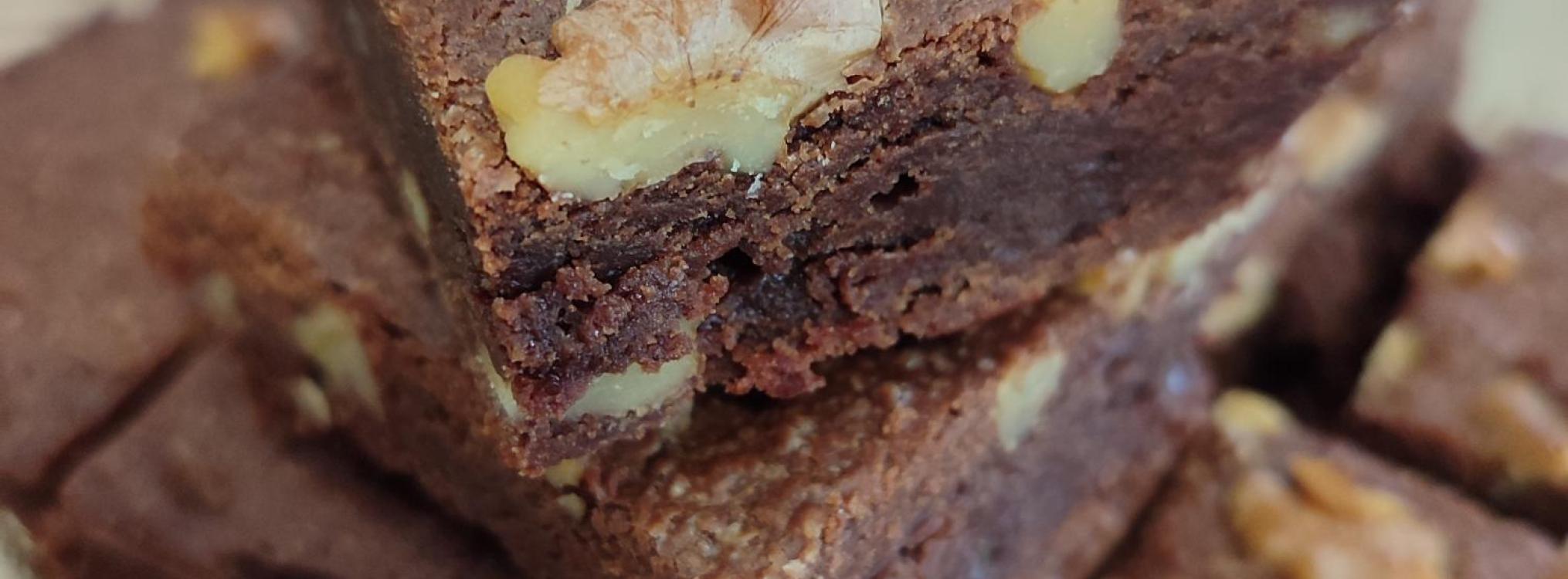 Un brownie à la farine de sarrasin, fondant au bon goût chocolaté avec des noix croquantes.