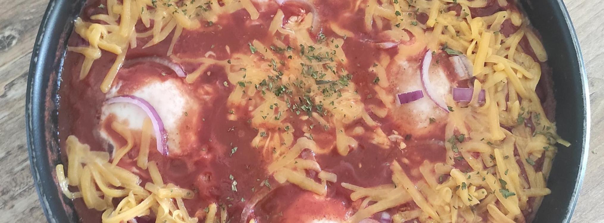 Un plat simple, des œufs mijotés dans une sauce tomate parfumée aux épices mexicaines, agrémentés de cheddar.
