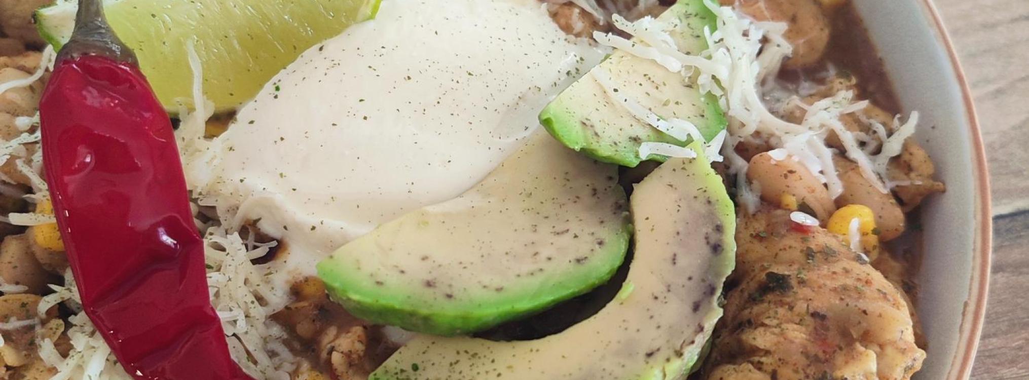Ça reste un ragoût, mais il y a quelques différences avec le chili classique : le bœuf est remplacé par du poulet, les haricots rouges par des blancs, les tomates par du maïs.