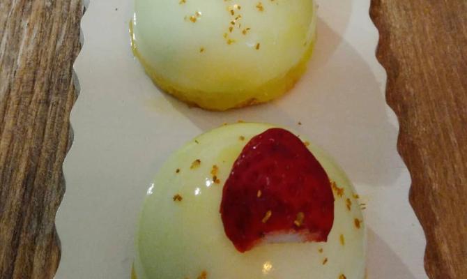 Dôme yaourt, cœur à la fraise & son biscuit citron