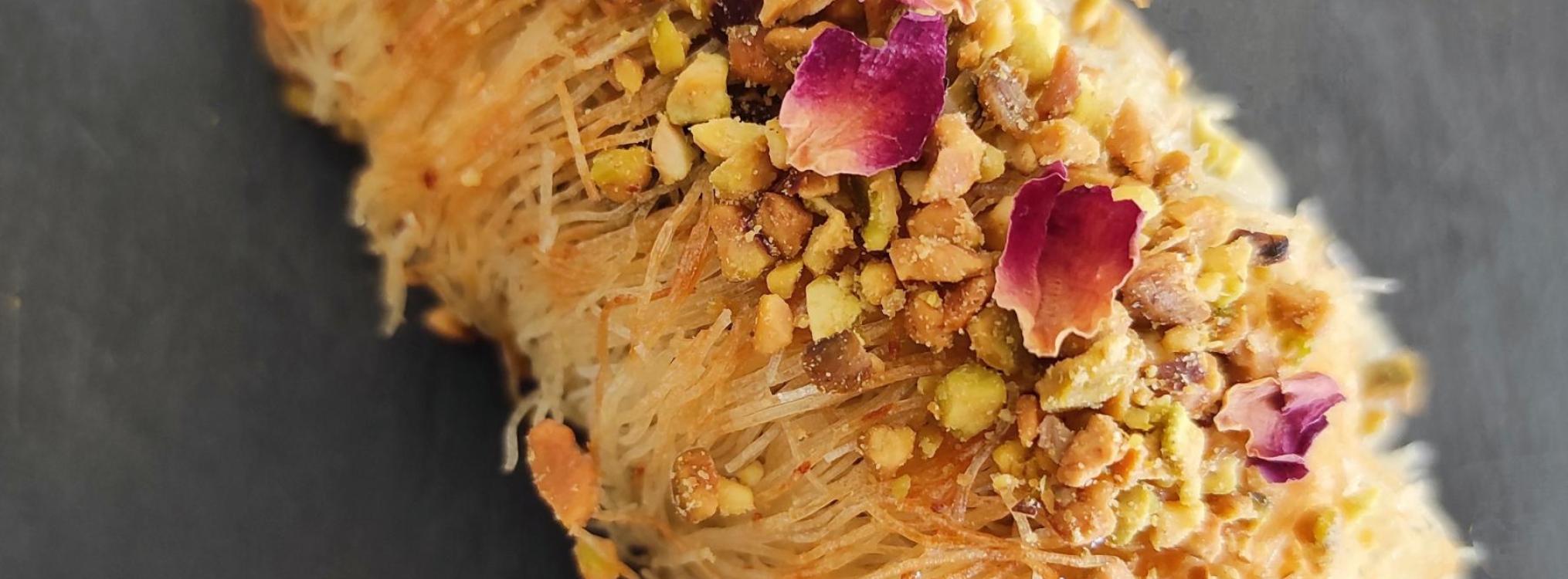 Fait avec du Kadaïf (vermicelles de pâte phyllo).