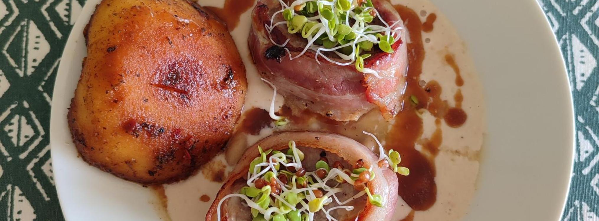 2ᵉ recette de l’atelier cuisine : des médaillons de filet mignon de porc bardés de lard, accompagnés d’une crème aux haricots tarbais (légèrement parfumée avec de la crème de coco) et de pommes aux épices.