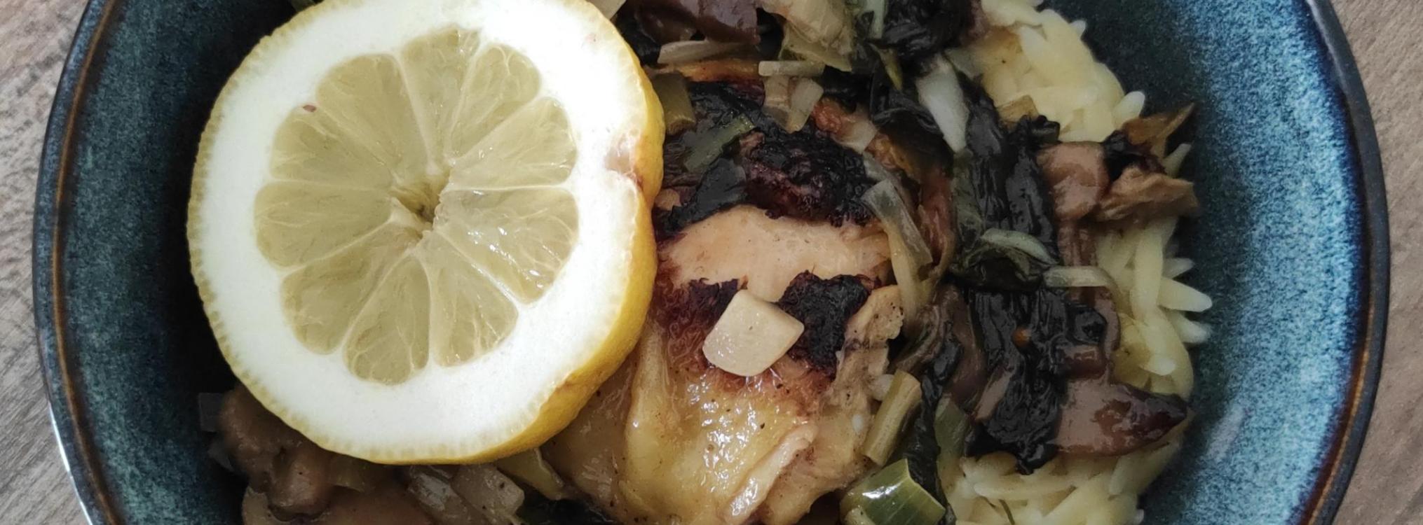 Émincez les légumes et ajoutez-les au poulet. Ajoutez l'ail écrasé, l'orzo, les branches de thym.