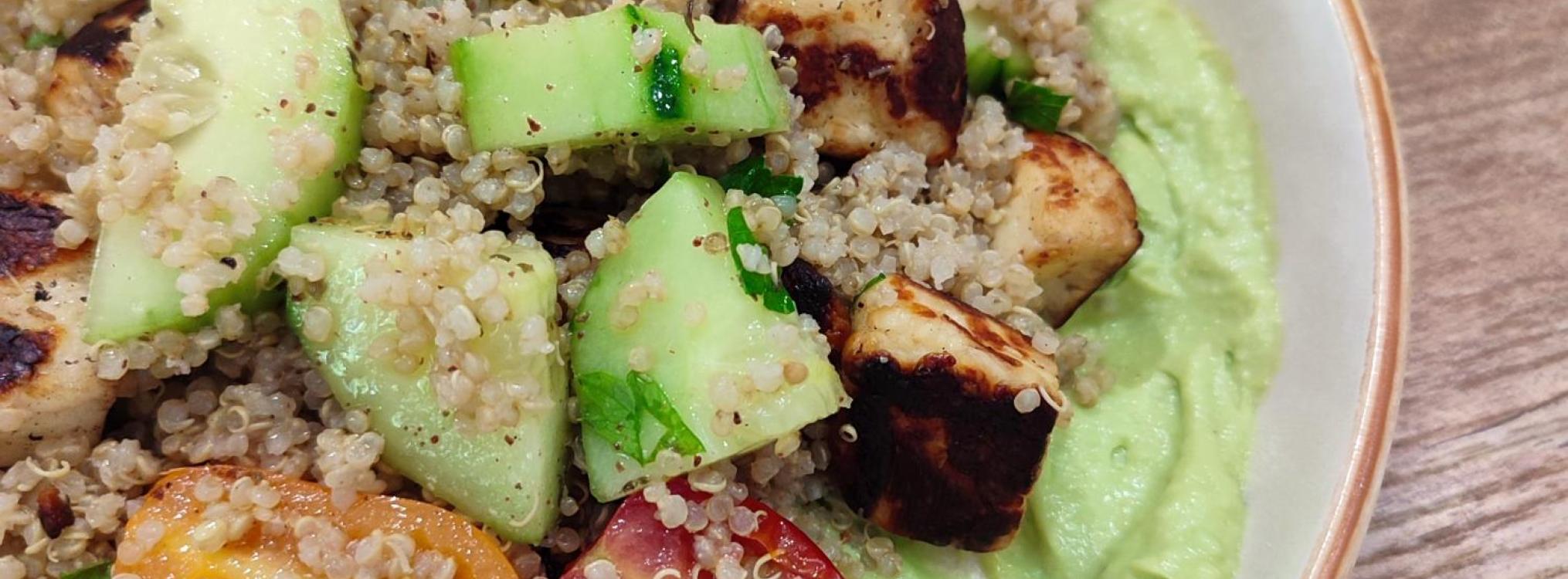 Mélangez le quinoa, les légumes découpés, la menthe, le persil et le fromage.