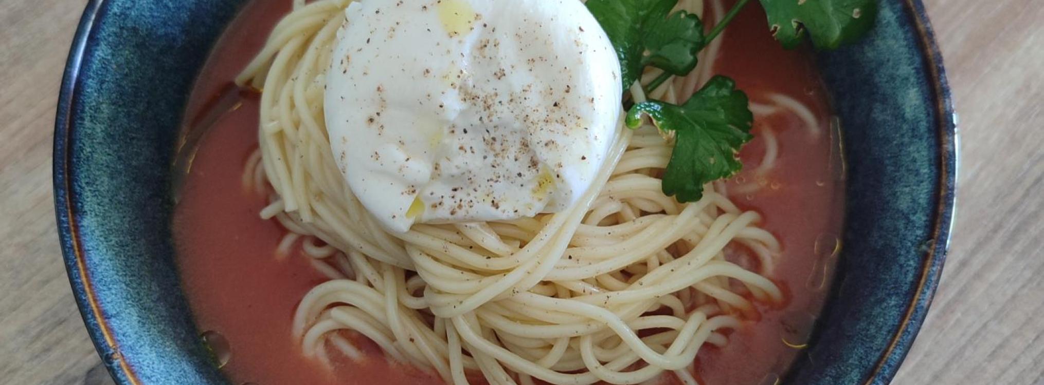 Dans des assiettes creuses ou des bols, versez du gaspacho, au milieu déposez un nid de spaghetti.