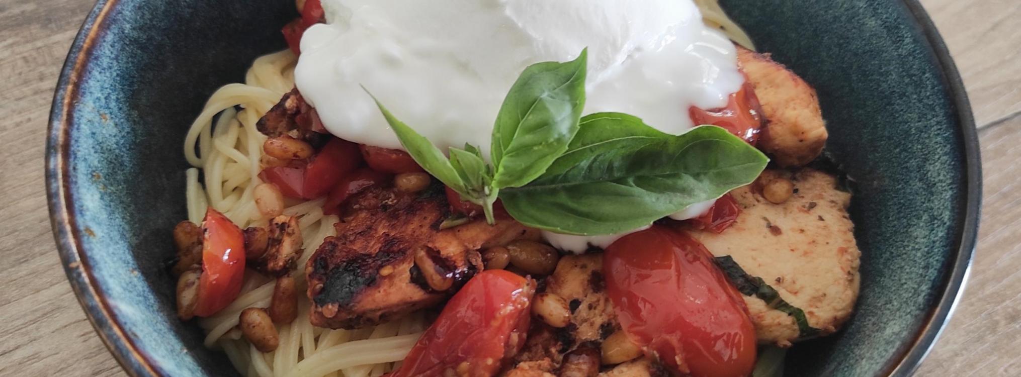 Fiche collector : Spaghetti au poulet, burrata et sauce à l’ail au beurre citronné