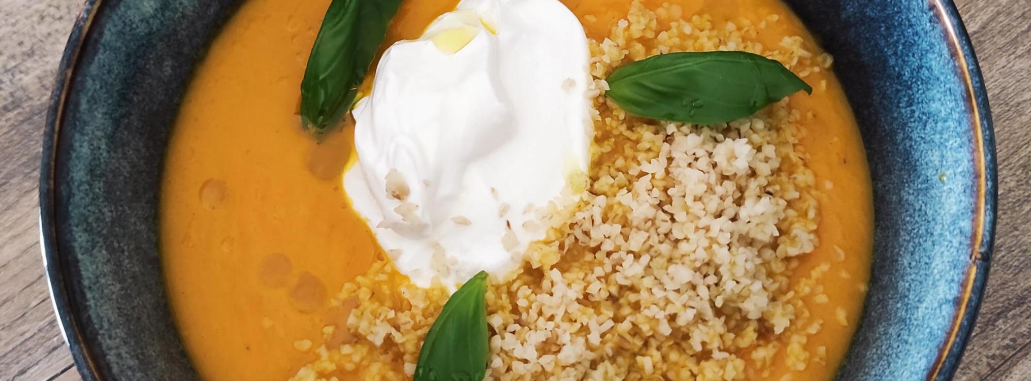 Avec cette soupe froide, on voyage en méditerranée avec des parfums marocains avec l'orange et le ras-el-hanout, du moyen orient avec le yaourt et le boulgour et italien avec le basilic.