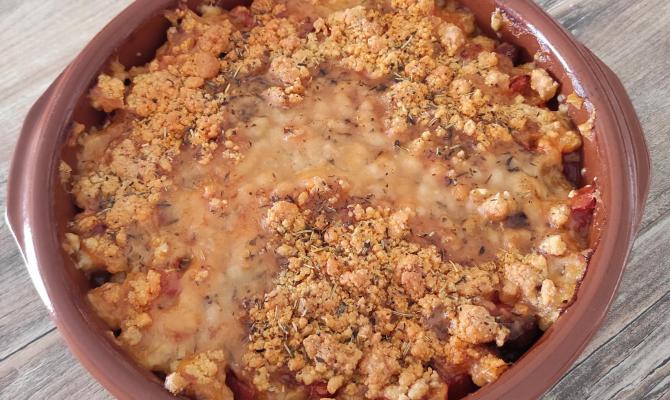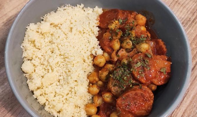 Suprême de volaille au chorizo, pois gourmands et tomates confites