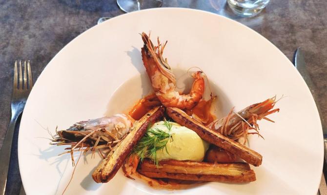 Bavaroise d’avocat, crevettes au fenouil et allumettes croustillantes aux 5 épices