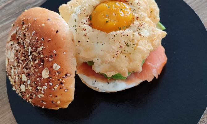 Hamburger fromage fines herbes, avocat, saumon et œuf nuage